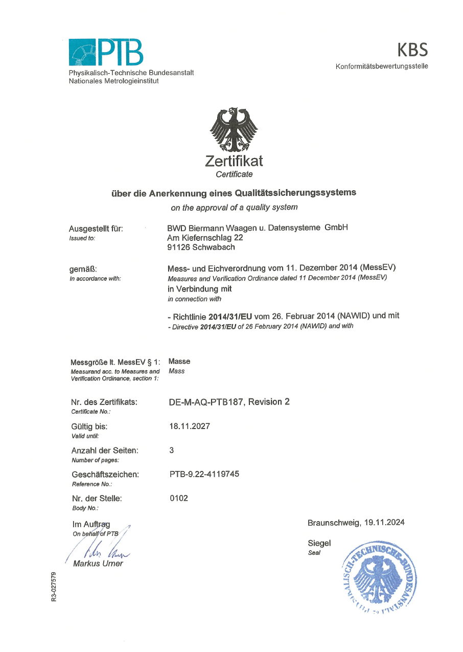 Durch diese Bevollmächtigung dürfen wir unsere Waagen im eichpflichtigen Verkehr konformitätsbewerten.