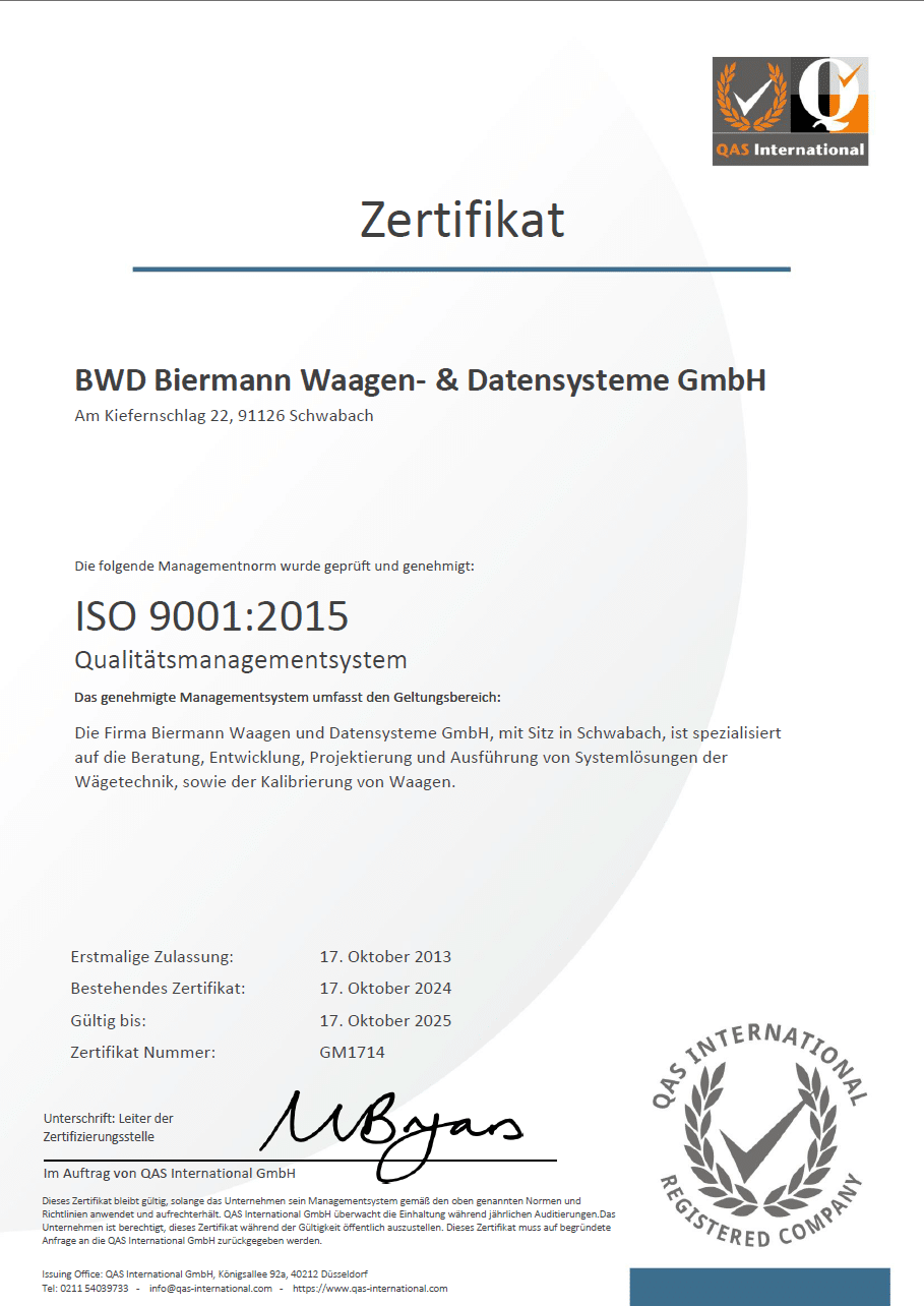 Das Qualitätsmanagement-System von BWD Biermann Waagen und Datensysteme GmbH wurde durch QAS International geprüft und genehmigt.